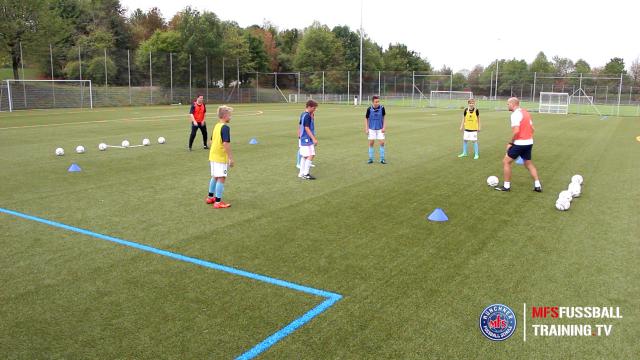 In dieser Spielform trainieren wir das Passspiel in Überzahl und das sofortige Gegenpressing nach Ballverlust.