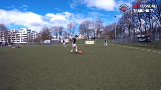 In dieser Passübung wird neben dem Passspiel der erste Kontakt trainiert. Dies kombinieren wir mit spielnahen Wendetricks.