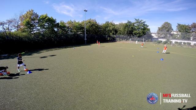 In dieser Zweikampfübung schulen wir das offensive 1 gegen 1 und 1 gegen 2. Dabei wird das defensive Verhalten im 2 gegen 1 natürlich auch trainiert.